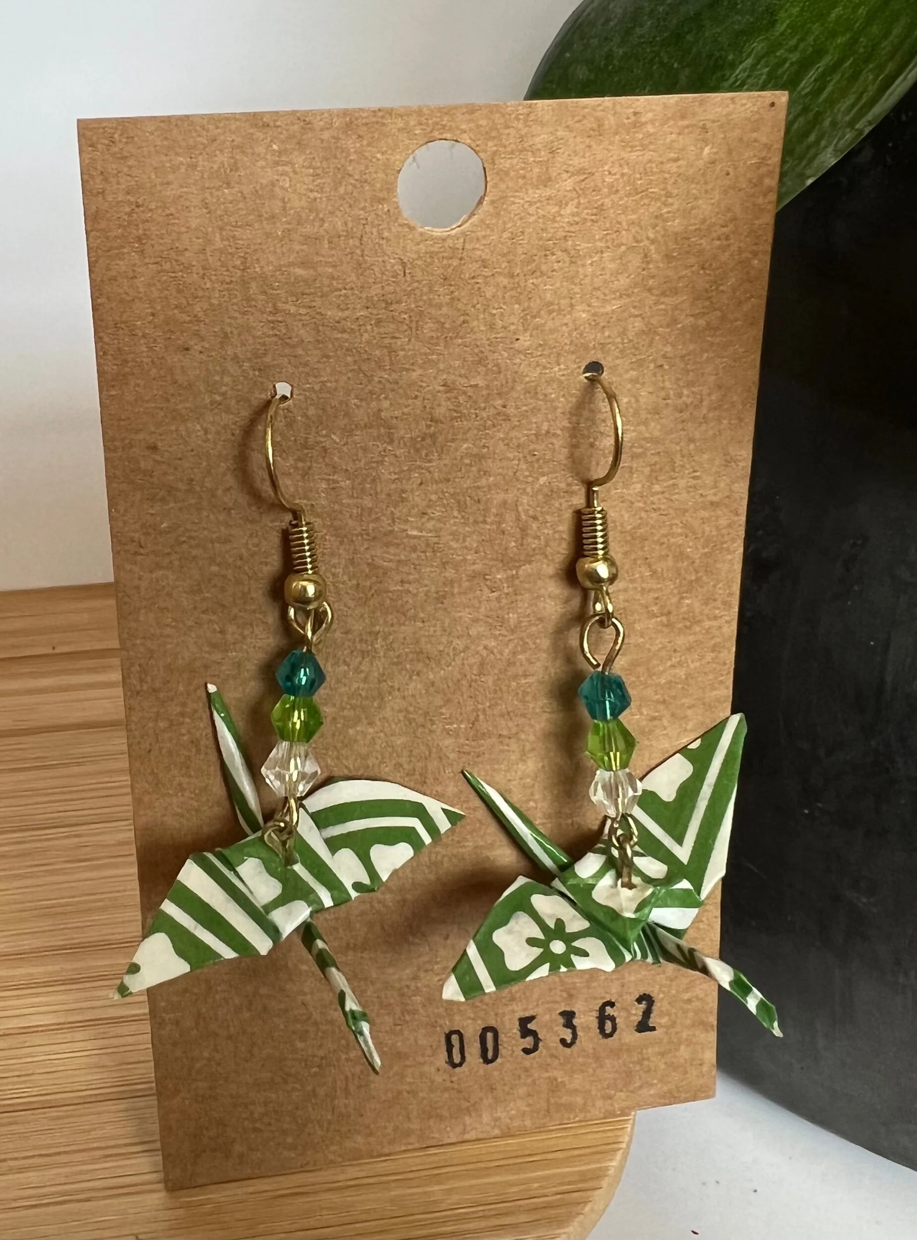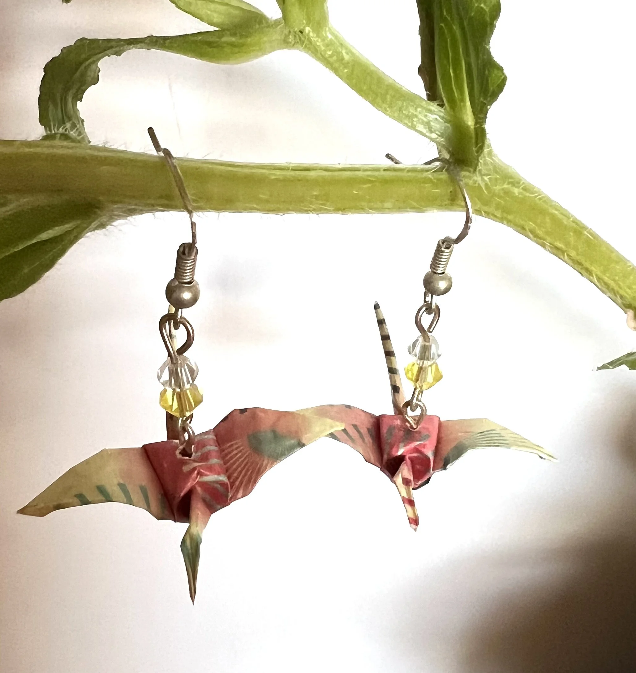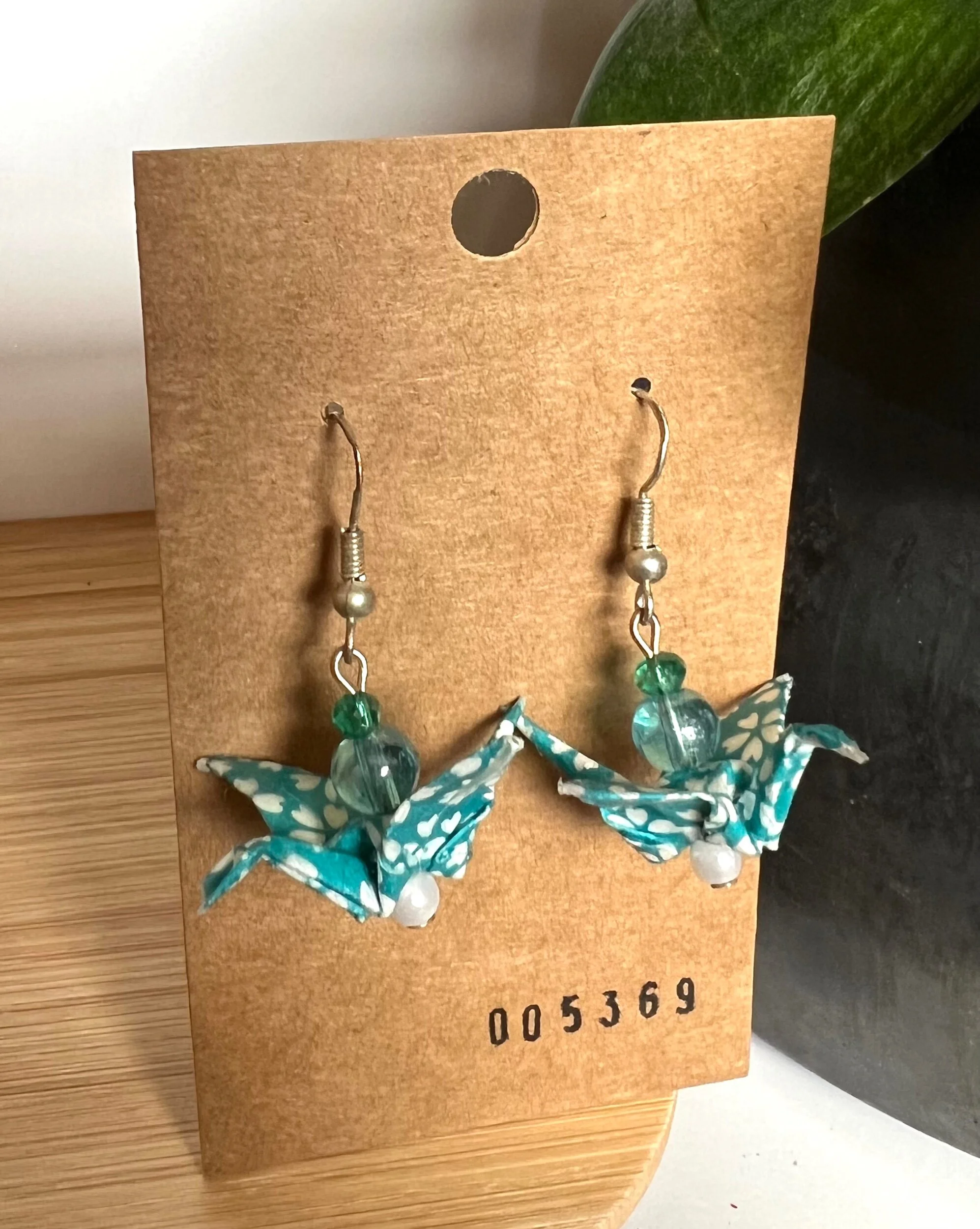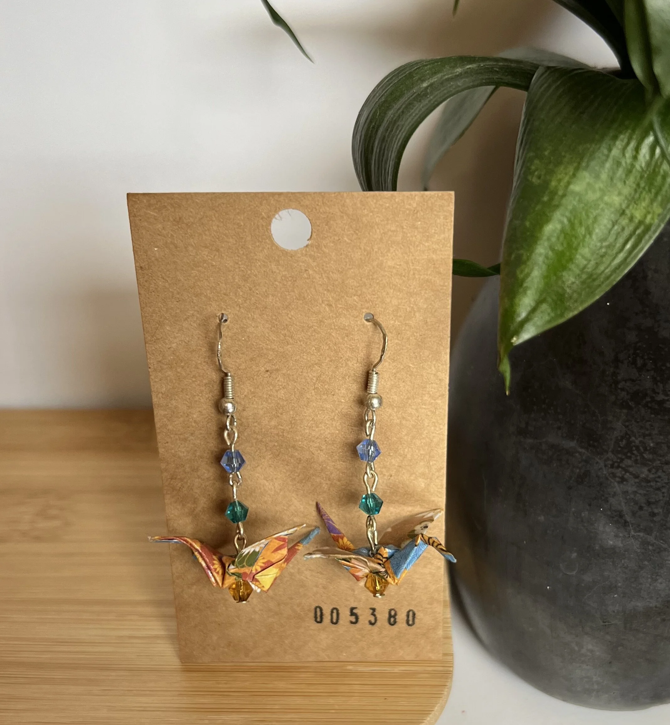 Each pair of earrings is light and delicate making them easy to wear, yet striking and unique. This design is based on the traditional origami crane, with each pair made of beautiful paper (we use recycled materials whenever possible). No two sets are quite alike.